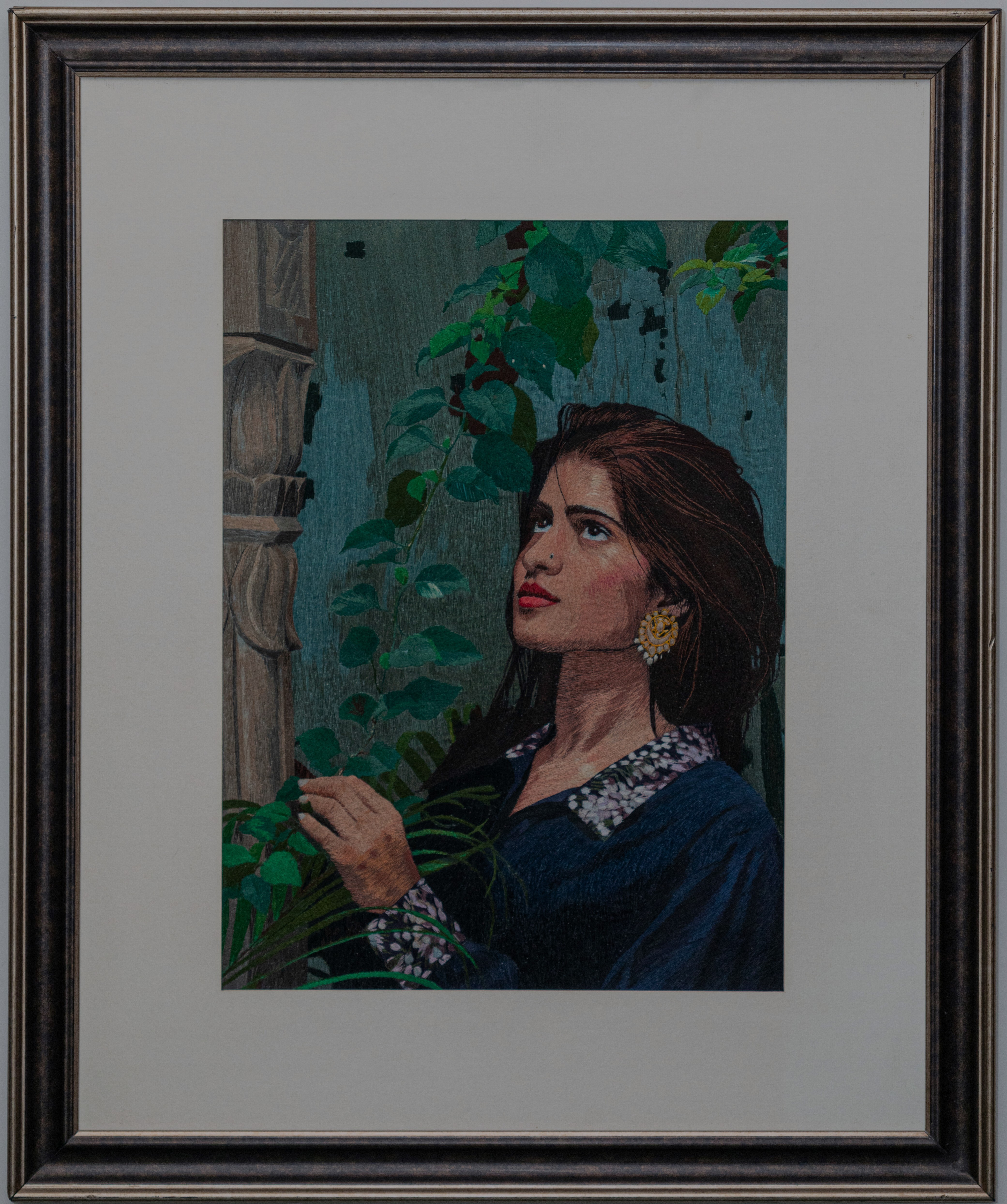 Choosing the right colors from a library of hundreds of spools collected from around the world, and meticulous blending of each strand is key to the making of this an intriguing piece of art.